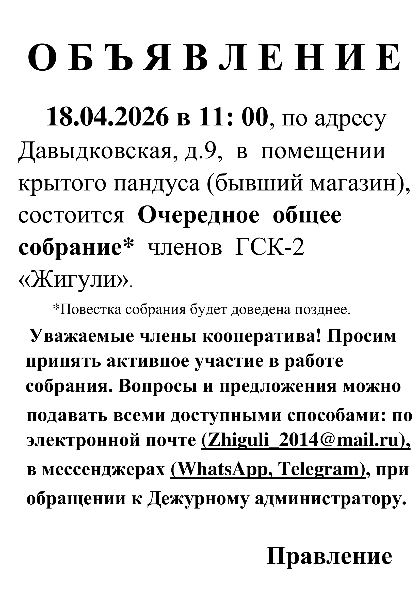 Информация Общего Собрания ГСК 2026 год