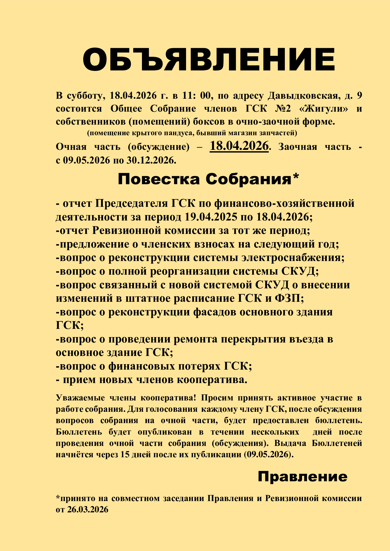 Объявление о Собрании членов ГСК и собственников